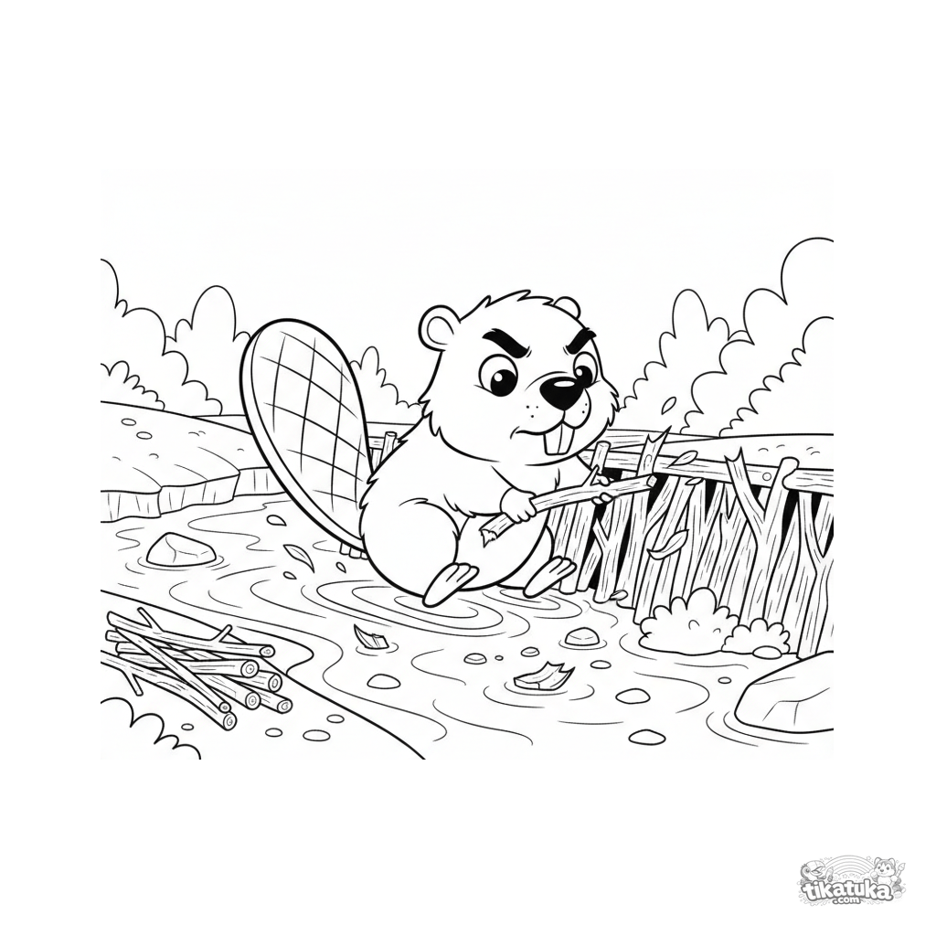 Página para colorear para preadolescentes 7-9: un castor trabajador construye una presa de palos en un arroyo. Pose dinámica, acción clara.