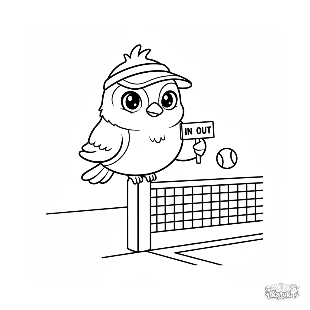 Página para colorear simple para niños pequeños 2-3: un pájaro divertido como juez de línea en una pista de tenis. Formas grandes, pocos detalles.