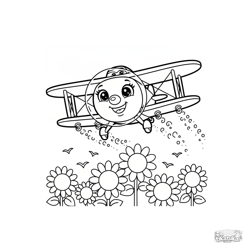 Página simple para colorear de un biplano agrícola alegre con cara sonriente, volando sobre un campo de girasoles. Formas grandes para niños de 2-3 años.