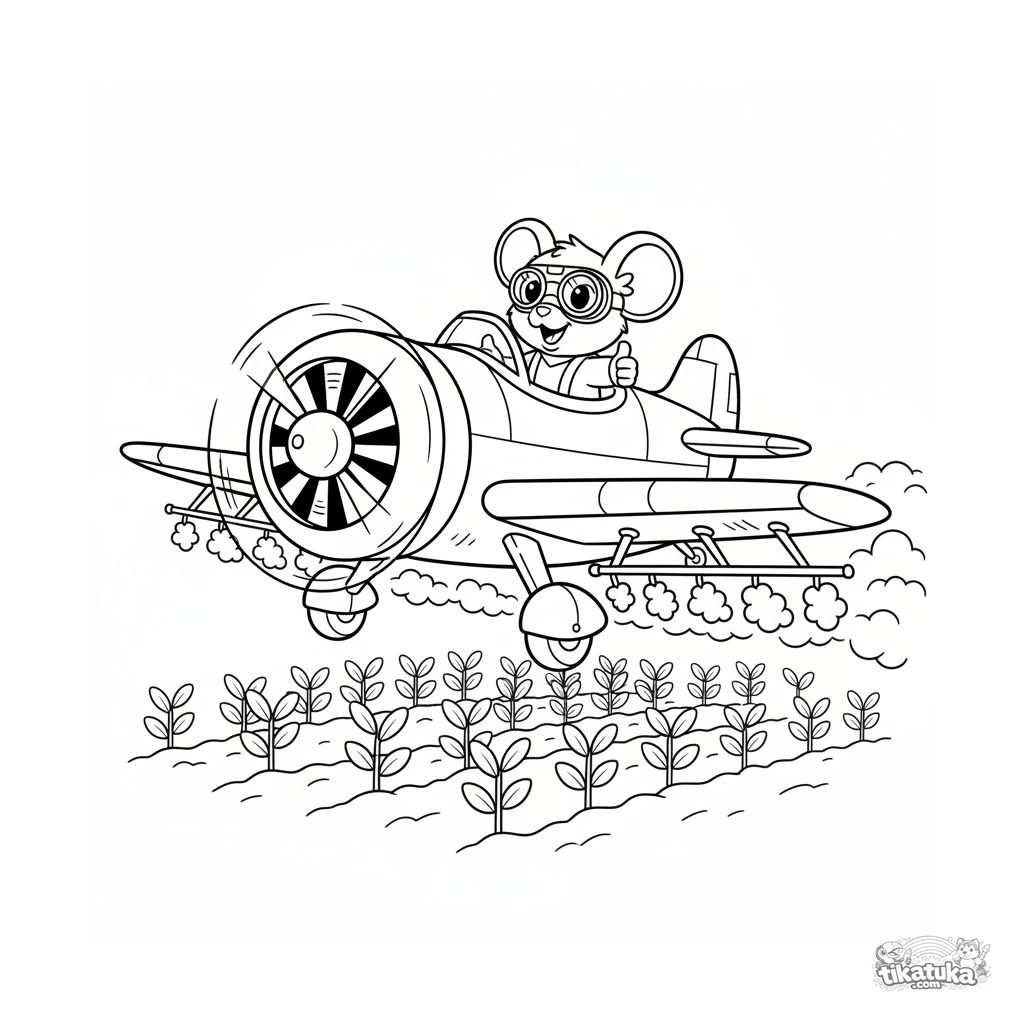 Página para colorear de un avión fumigador volando bajo sobre un campo de maíz. Piloto ratón con gafas. Para niños de 4 a 6 años. Estilo chibi simple.