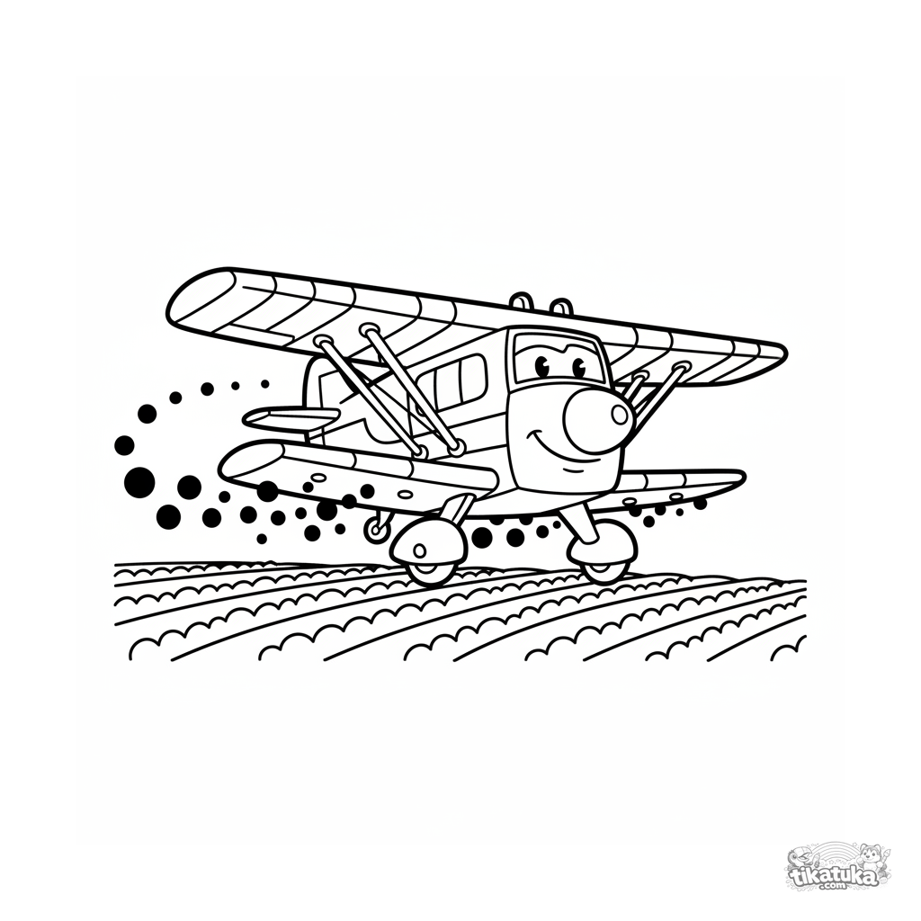 Página simple para colorear de un avión fumigador de dibujos animados volando sobre una granja. Formas grandes y contornos claros, perfecta para los más pequeños de 2-3 años.