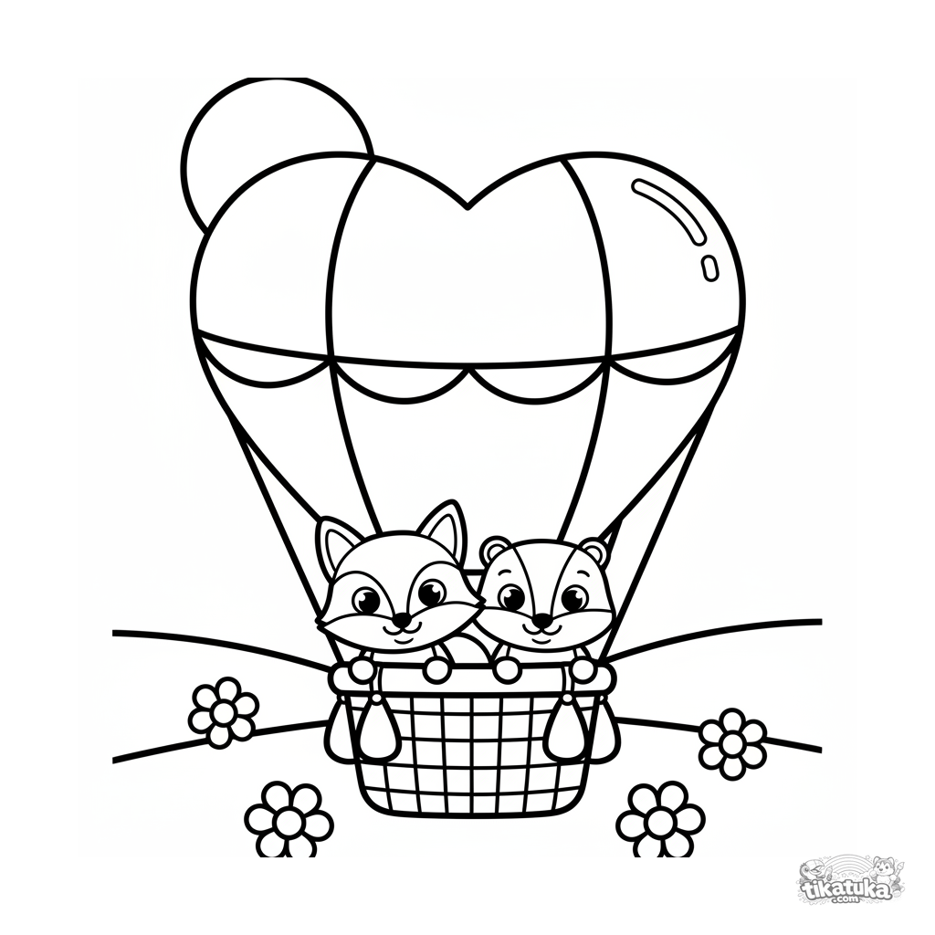 Página simple para colorear para niños pequeños: un globo con forma de corazón flota sobre un prado lleno de flores al atardecer. Un zorro y un tejón sonrientes están en la cesta. Formas grandes, contornos gruesos.