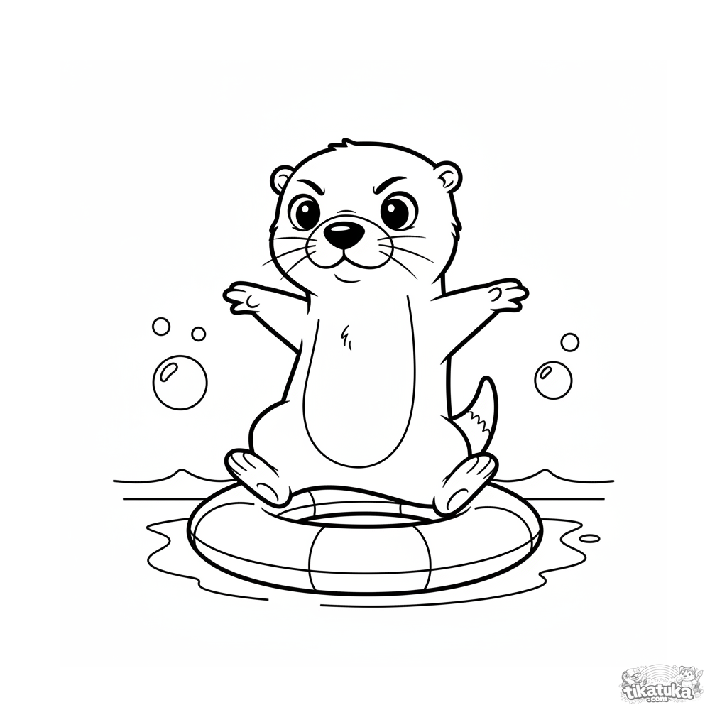 Página para colorear para niños de 7-9 años: una juguetona nutria al estilo cómic intenta mantener el equilibrio en un aro inflable desinflado.