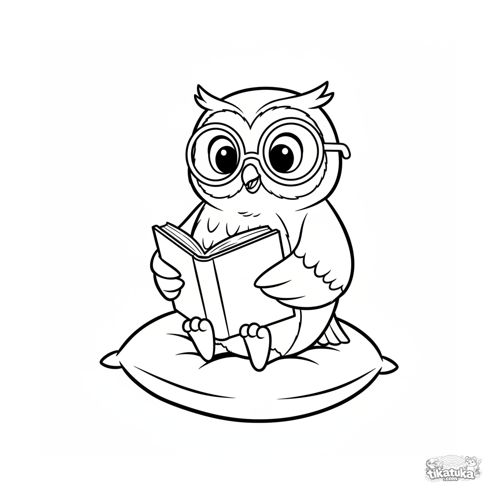 Página para colorear de dibujos animados estilo Disney para niños pequeños: un búho con gafas y un libro en un cojín. Líneas fluidas, formas simples, para 2-3 años.