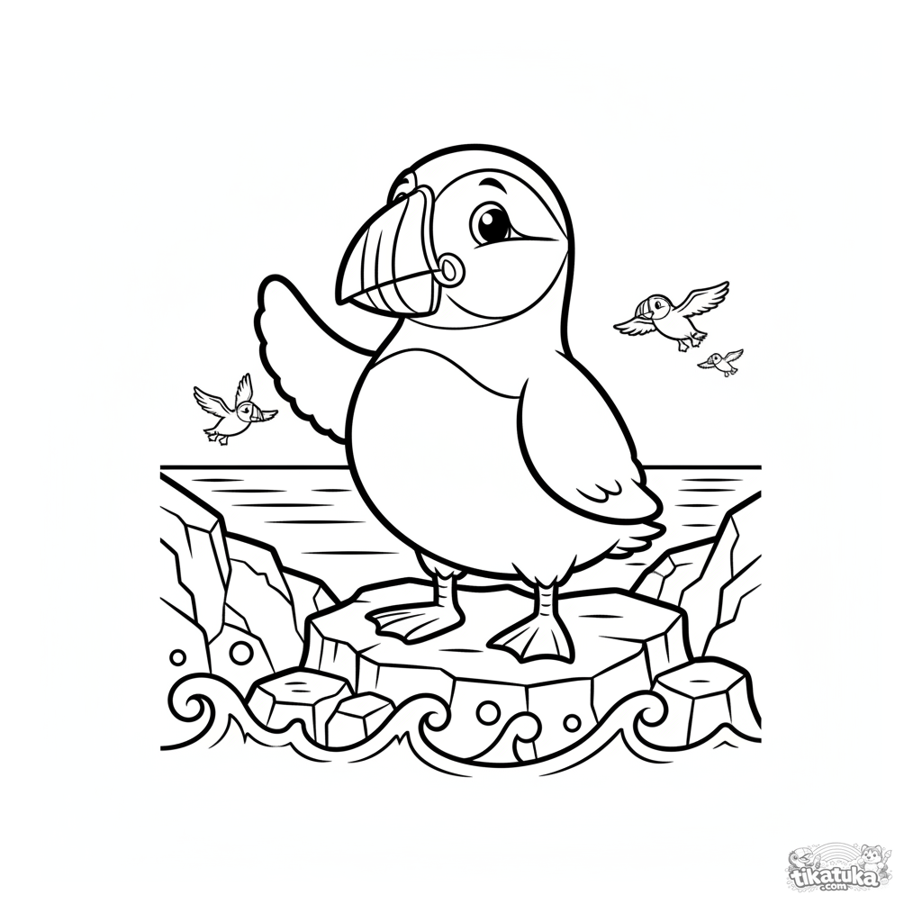 Página para colorear de un frailecillo de dibujos animados en un acantilado marino. Para niños de 4 a 6 años.