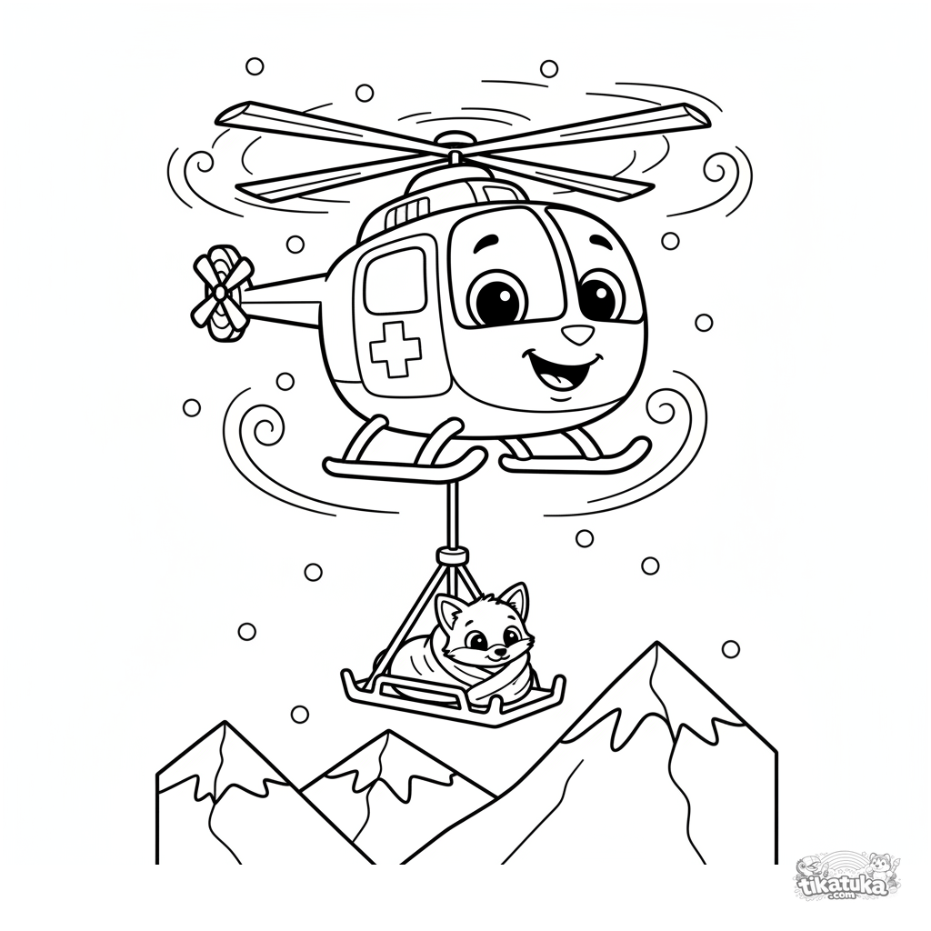 Página para colorear de un helicóptero de rescate sobre una montaña nevada. Para 4-6 años. El helicóptero baja un cable para rescatar un zorrito.