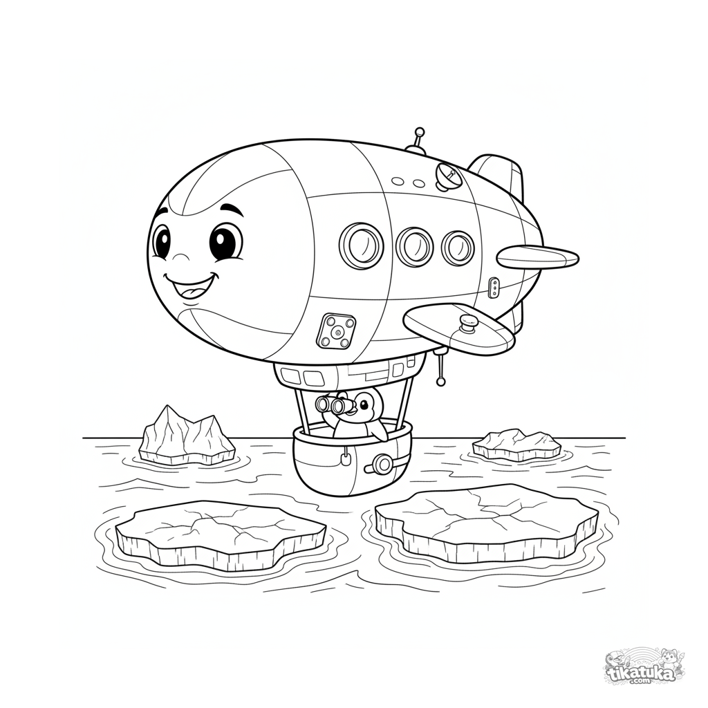 Página para colorear para preadolescentes 7-9: un dirigible de investigación amigable con cara sonriente se cierne sobre bloques de hielo ártico. Un científico pingüino observa con prismáticos.