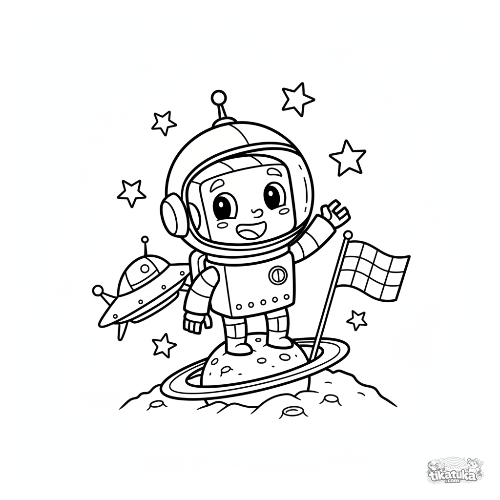 Página para colorear de un robot astronauta amigable plantando una bandera en un planeta anillado. Para niños pequeños de 2 a 5 años.