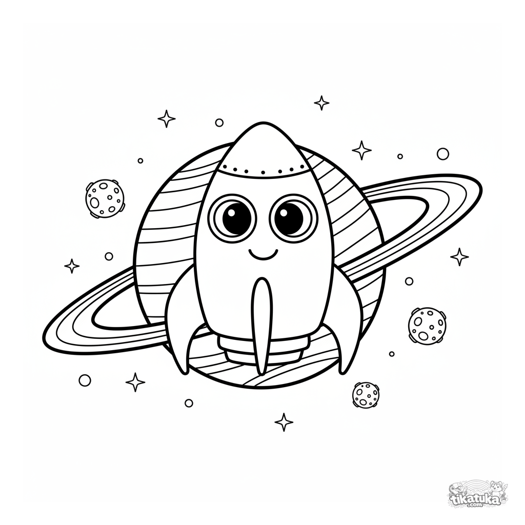 Página para colorear de un cohete orbitando un planeta gigante con anillos. Para niños de 5 a 8 años.