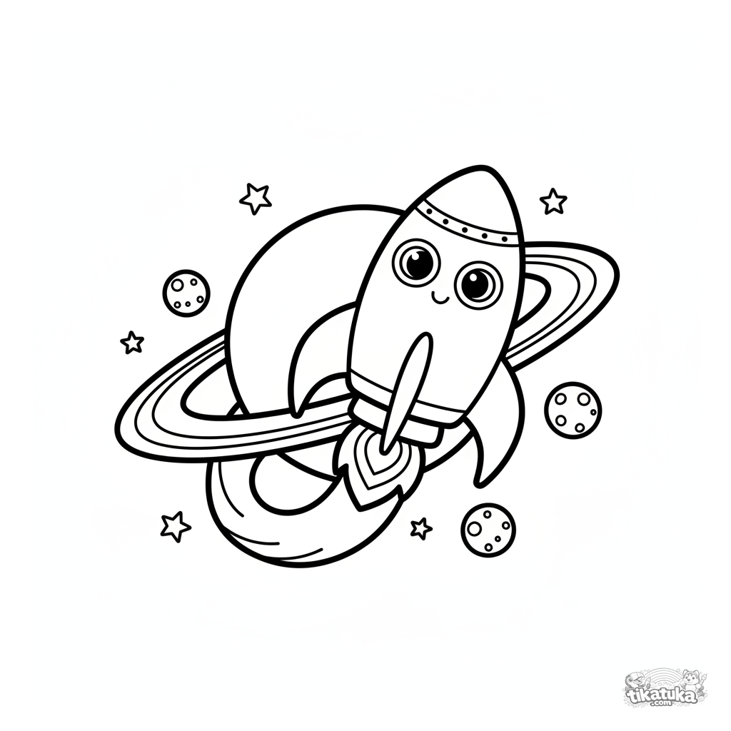 Página para colorear para niños pequeños 2-3: un cohete amigable con ojos de ventana vuela alrededor de un gran planeta anillado. Contornos extremadamente simples, detalles grandes.