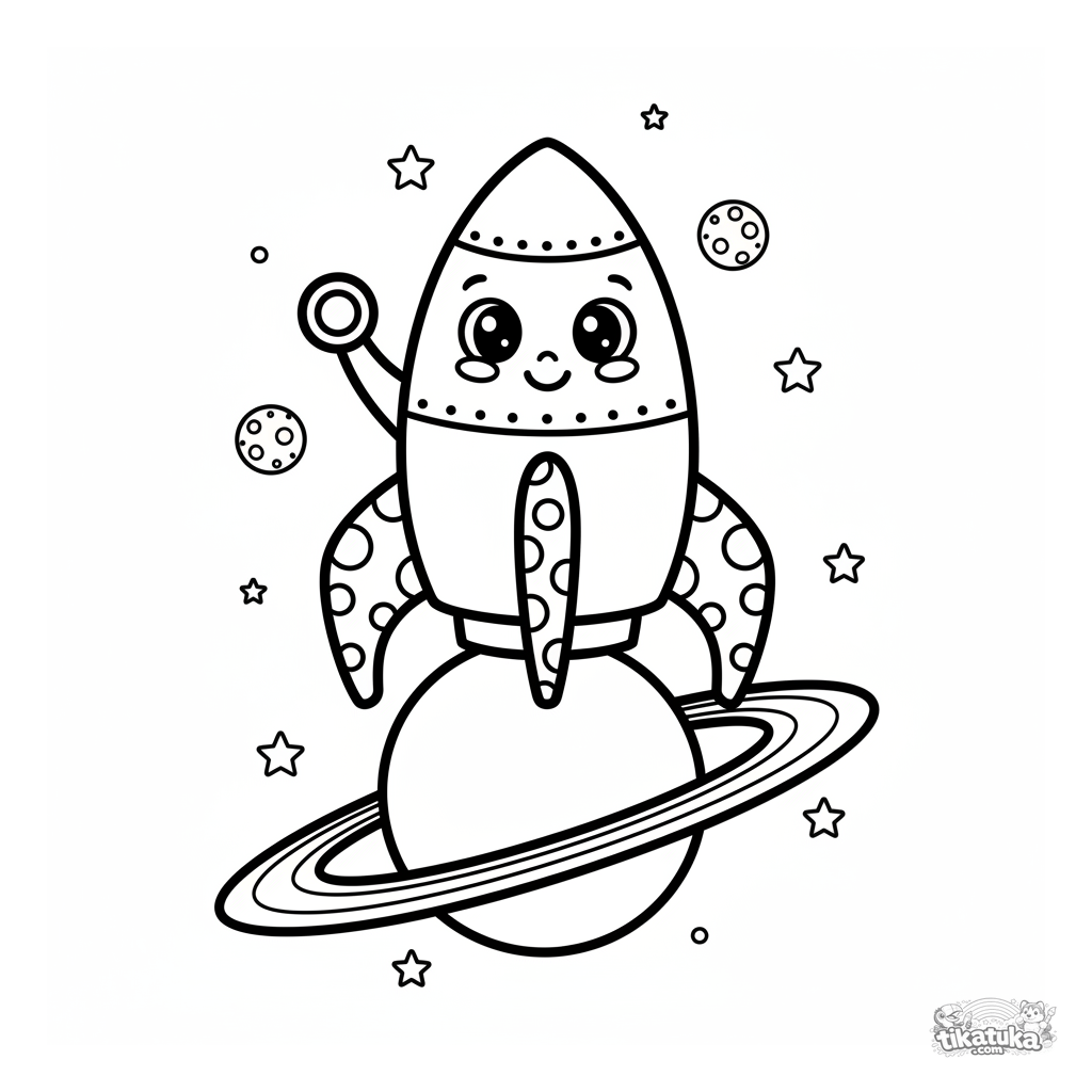 Divertida página para colorear de un cohete de lunares orbitando un planeta anillado. Para niños de 3 a 6 años, formas simples.