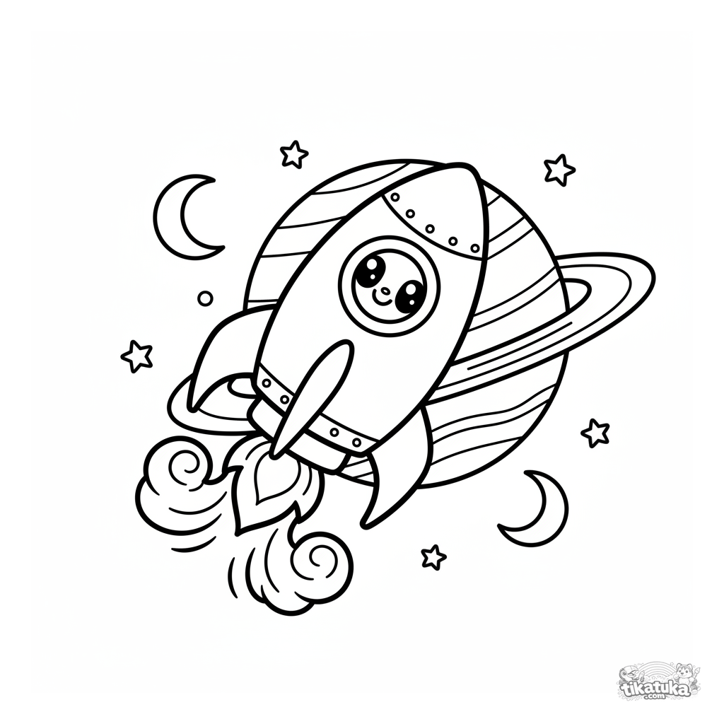 Página para colorear espacial fácil para niños pequeños 2-5 años: un cohete alegre con cara sonriente vuela alrededor de un gran planeta anillado contra un vasto fondo blanco con estrellas simples.