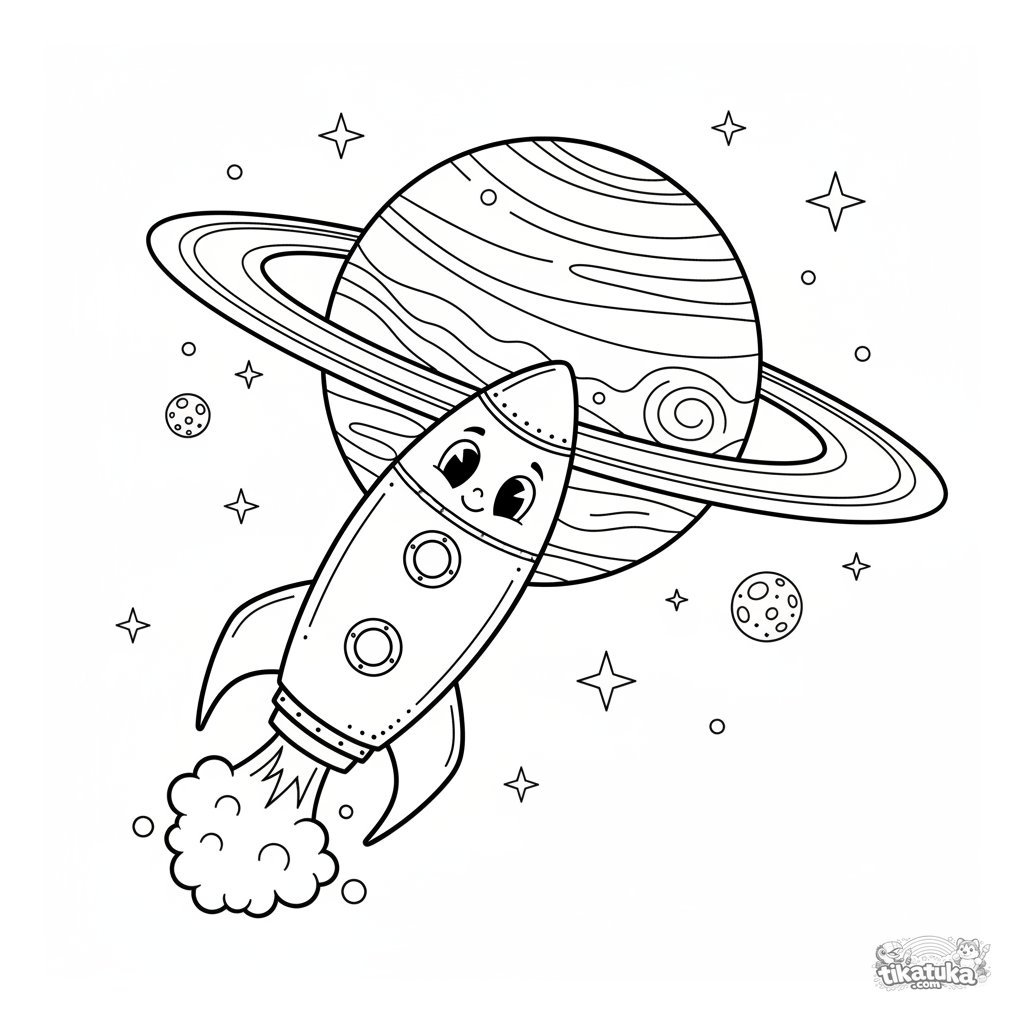 Página para colorear de un cohete espacial orbitando un planeta anillado. Para 5-8 años. Escena estilizada con cohete sonriente, lunas y estrellas.