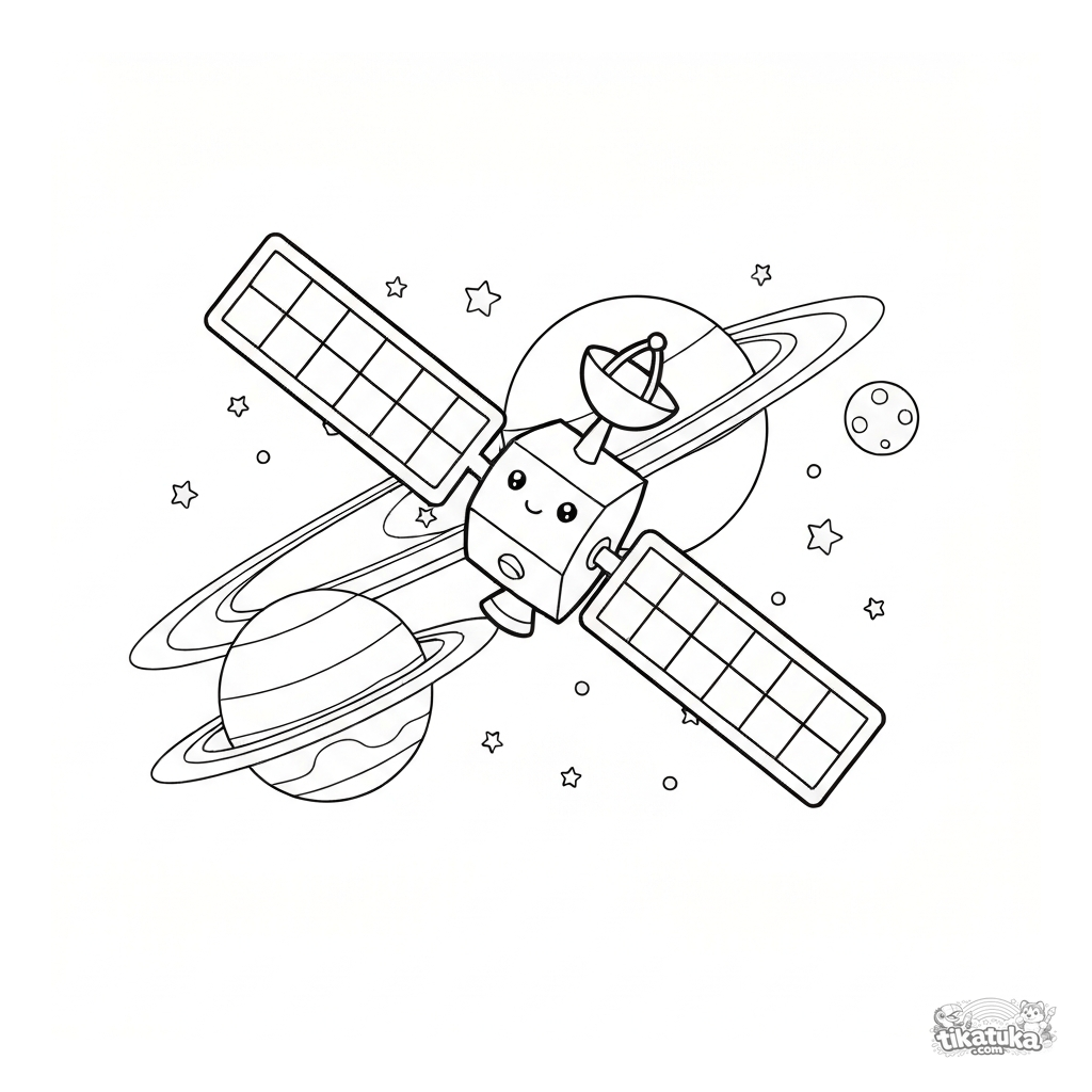 Página simple para colorear para niños pequeños: satélite en el espacio. Satélite amigable con paneles solares orbita un planeta anillado. Para niños de 2 a 5 años.