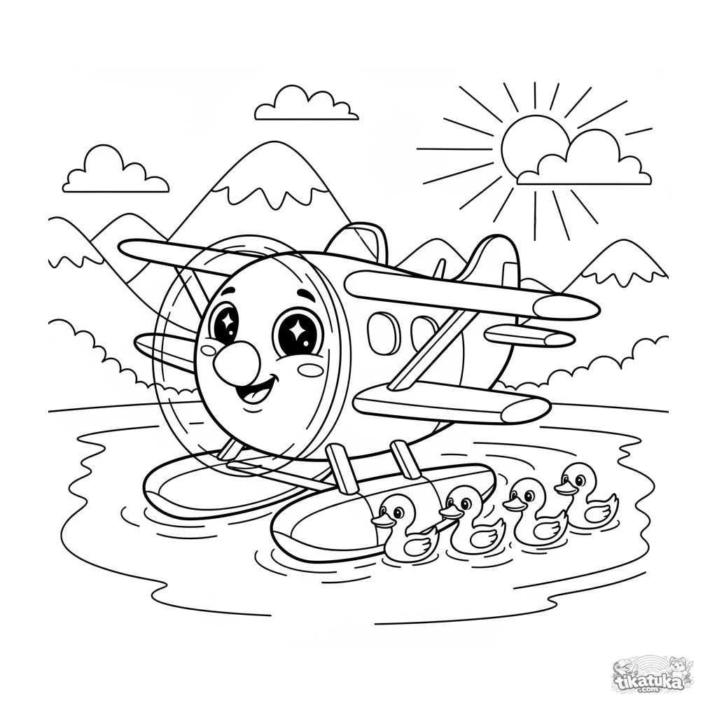 Página para colorear para niños 7-9: un hidroavión alegre con una sonrisa rueda por un lago de montaña, seguido por patos curiosos. Escena brillante y dinámica.