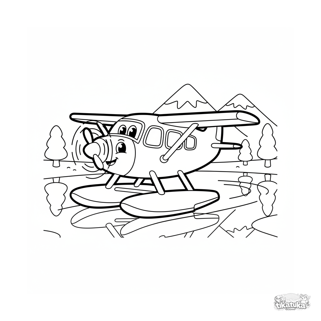 Página para colorear simple de un hidroavión de dibujos animados en un lago de montaña para bebés de 2 a 3 años. Formas grandes, contornos gruesos, detalles mínimos.