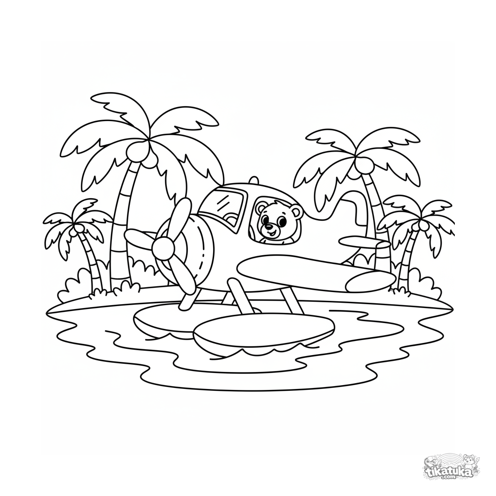 Página simple para colorear para niños pequeños de 2-3 años: un hidroavión alegre en un lago. Formas grandes, contornos claros.