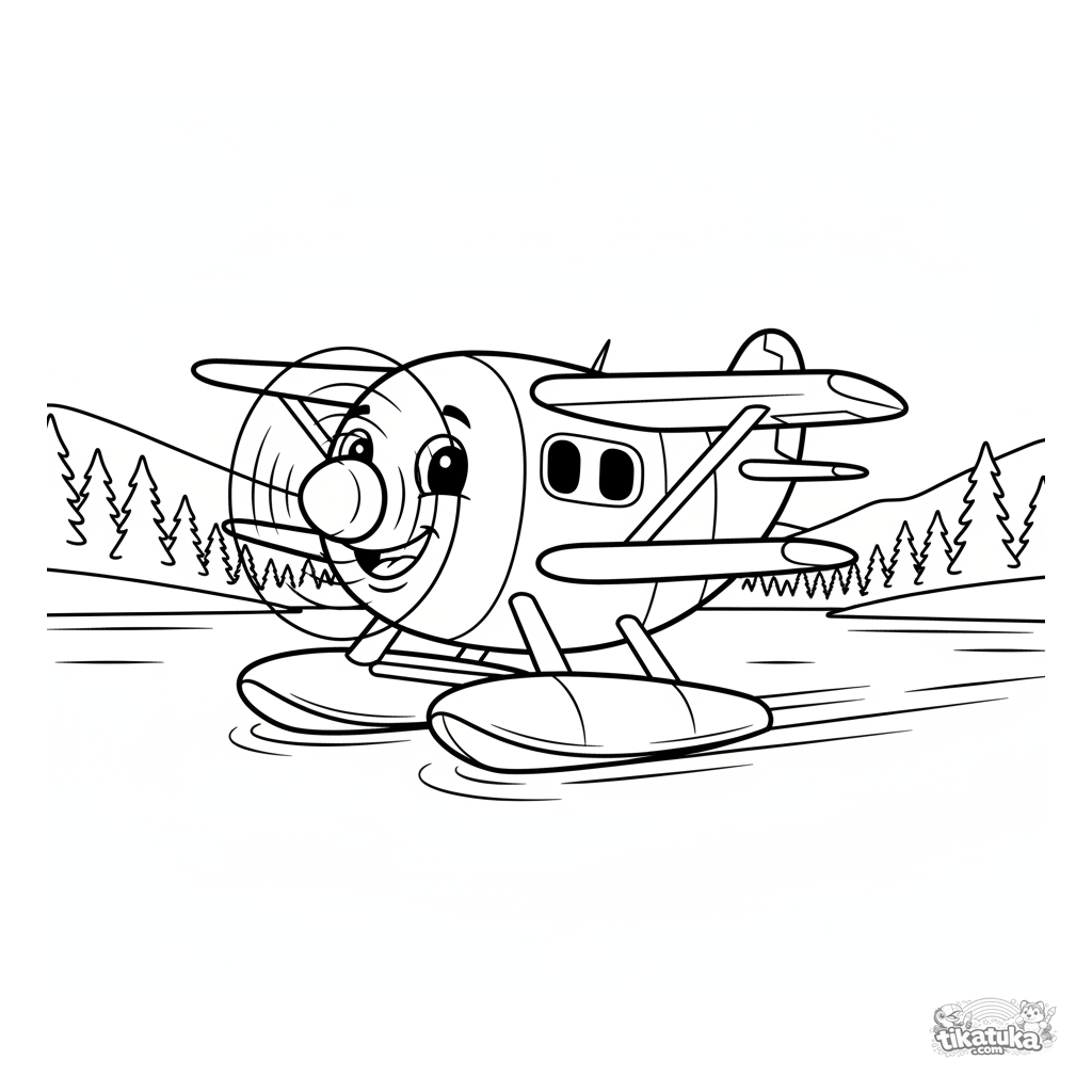 Página para colorear simple de un hidroavión amigable en un lago para niños pequeños de 2-3 años. Formas grandes, el avión tiene cara sonriente.