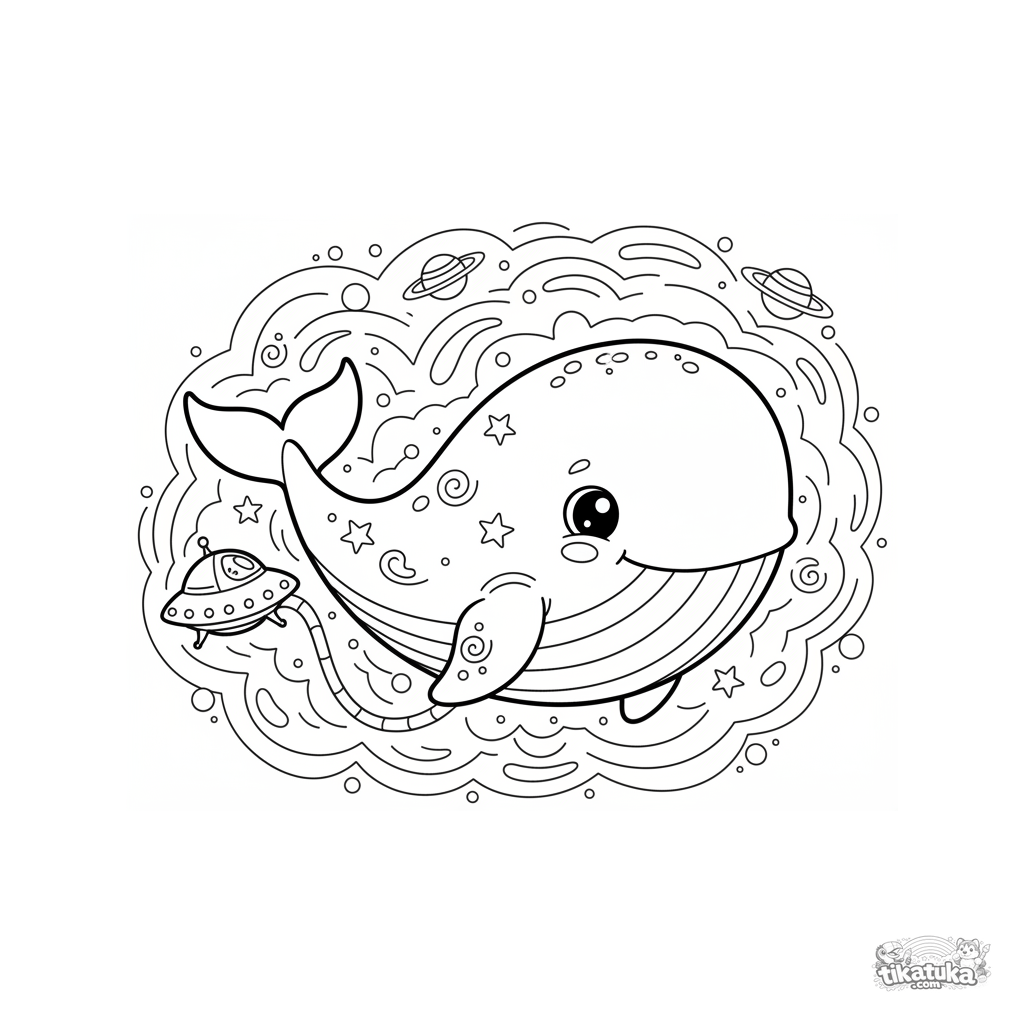 Página para colorear de una ballena espacial de dibujos animados nadando a través de una nebulosa colorida. Para niños de 3 a 6 años.