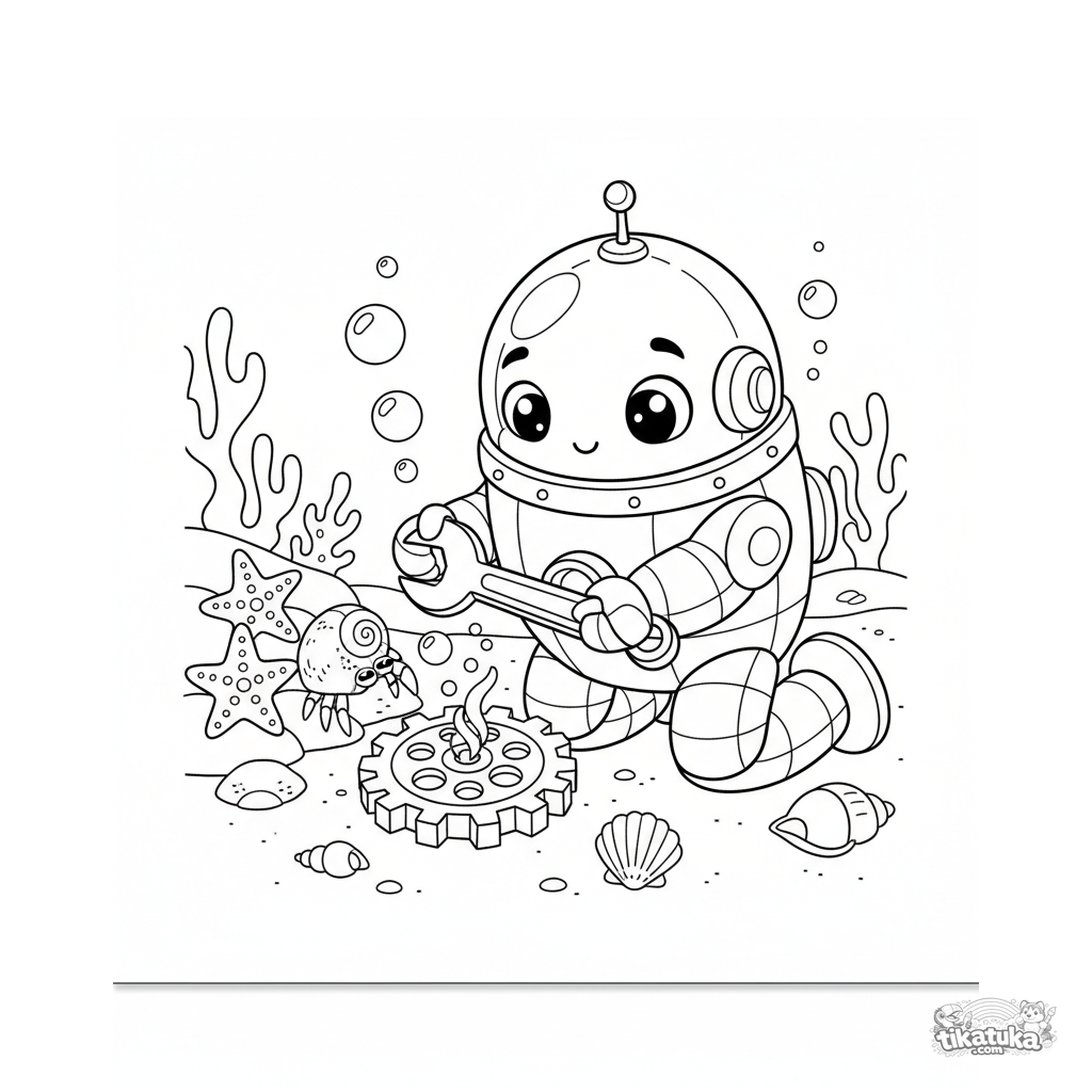 Página para colorear de un robot con forma de submarino arreglando un gran engranaje en el fondo del océano. Para niños de 4 a 6 años. Incluye estrellas de mar y cangrejo ermitaño.