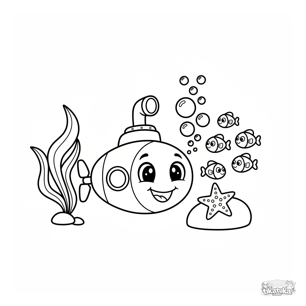 Página para colorear para niños pequeños: un submarino feliz con cara soplando burbujas entre corales y peces. Formas simples para 2-3 años.