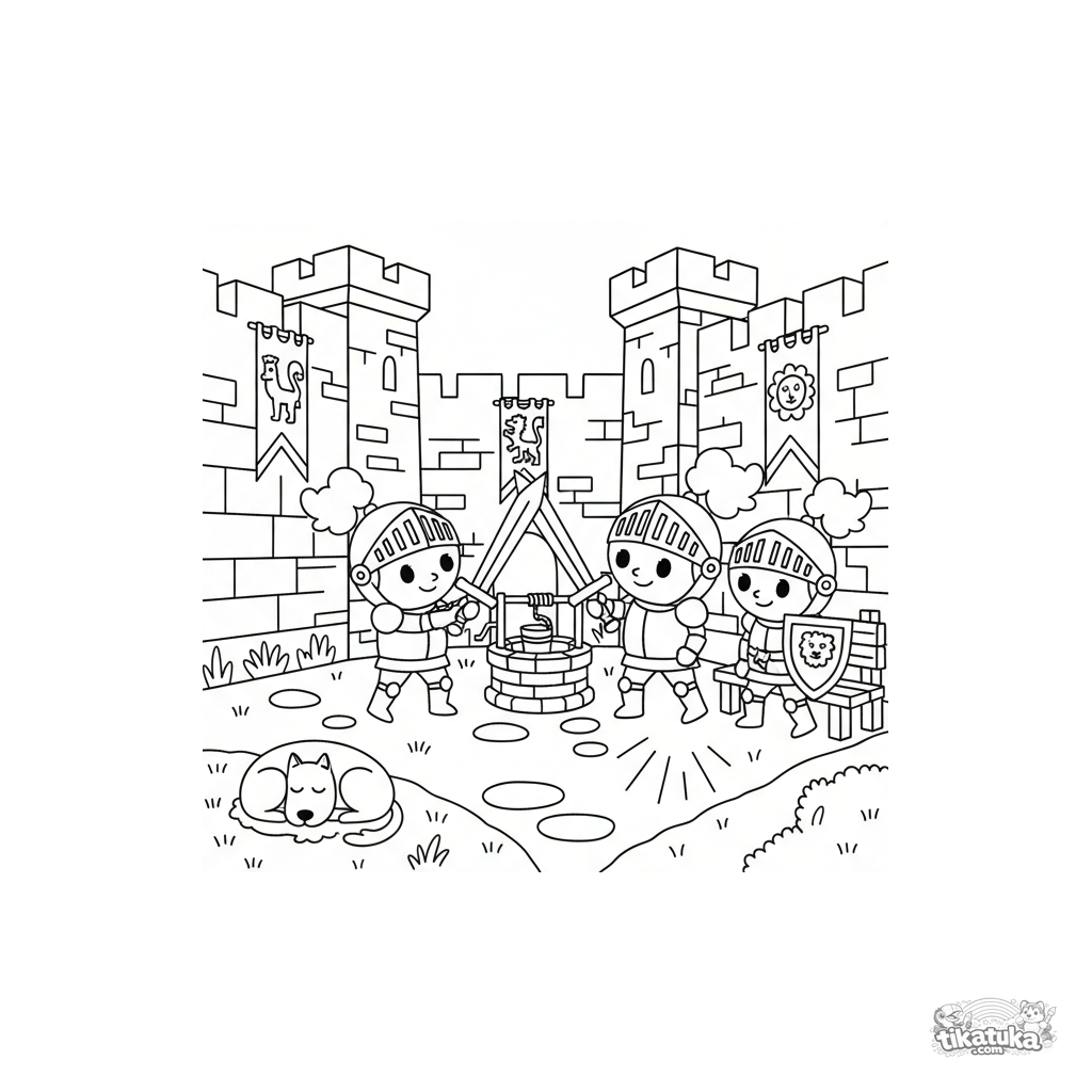 Página para colorear para niños: un patio de castillo animado donde caballeros practican y un perro duerme. Escena dinámica en estilo folclórico.