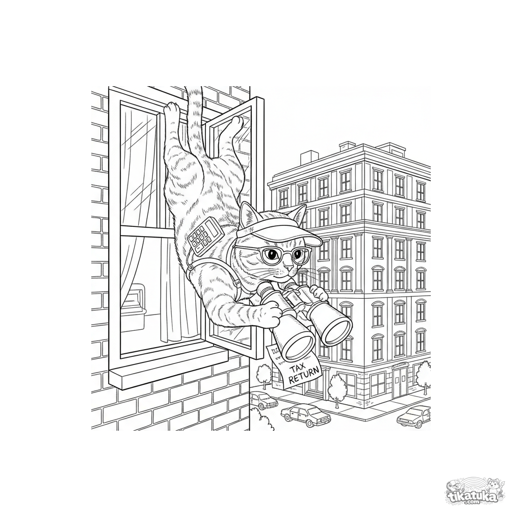 Página para colorear para niños mayores: un gato contable con gafas y una calculadora mira un banco con prismáticos desde la ventana. Meme financiero divertido y detallado.
