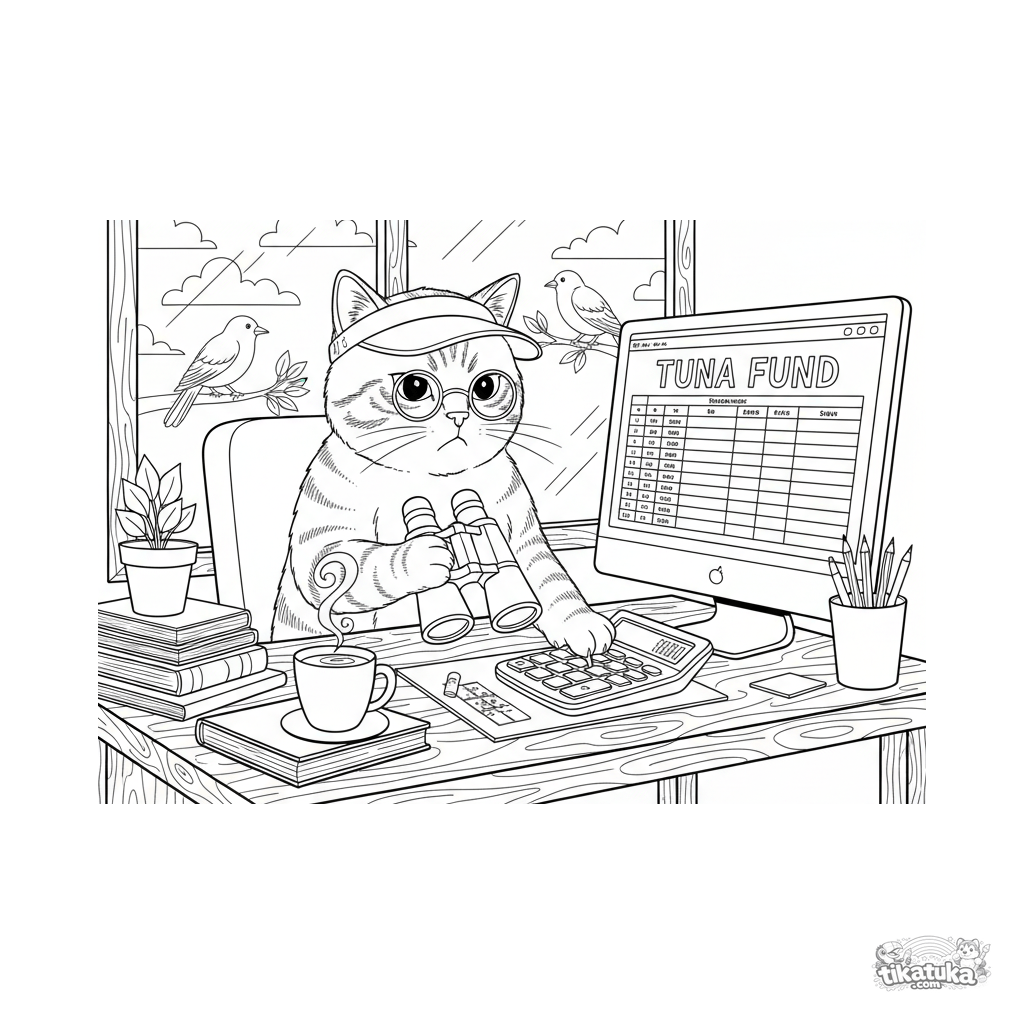 Página para colorear para niños 10-12: un gato contador serio con gafas en una ventana, calculando con una calculadora y mirando con binoculares una hoja de cálculo 'Fondo de Atún'. Ilustración humorística detallada.