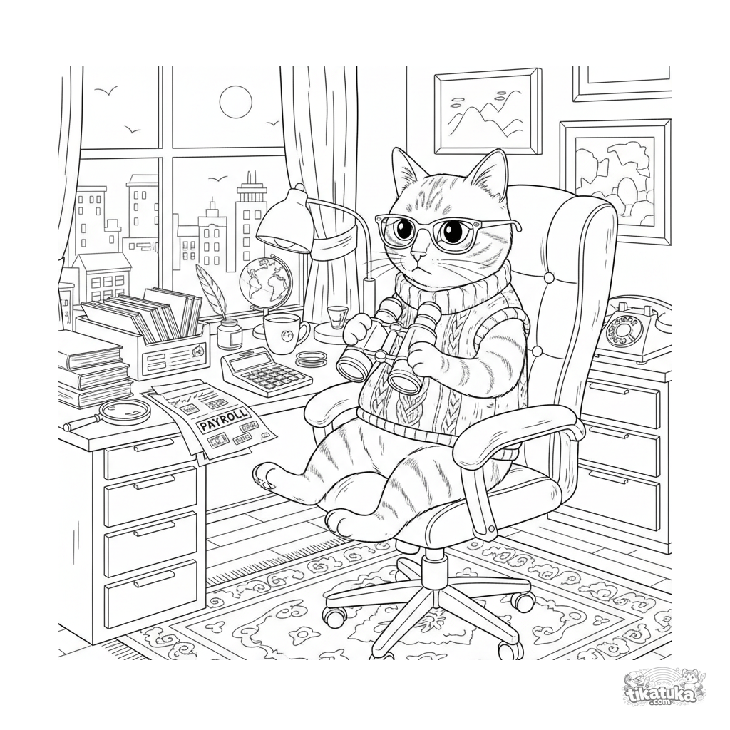 Página para colorear para niños 10-12: un gato contable en un escritorio usa prismáticos para buscar el pago. Escena realista y detallada con accesorios de oficina.