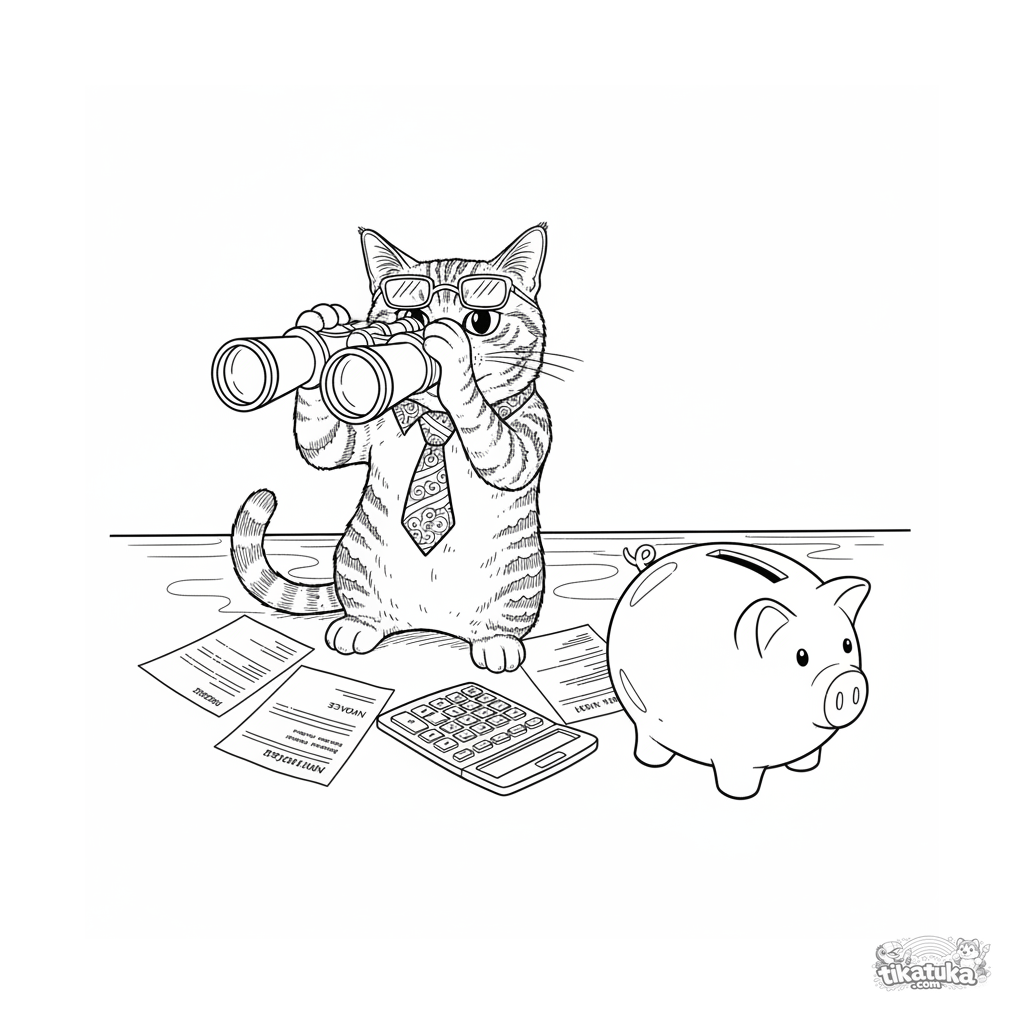 Página para colorir para niños 10-12: un gato contable con corbata mira con prismáticos una hucha en su oficina en casa. Escena divertida y detallada de espera del sueldo.