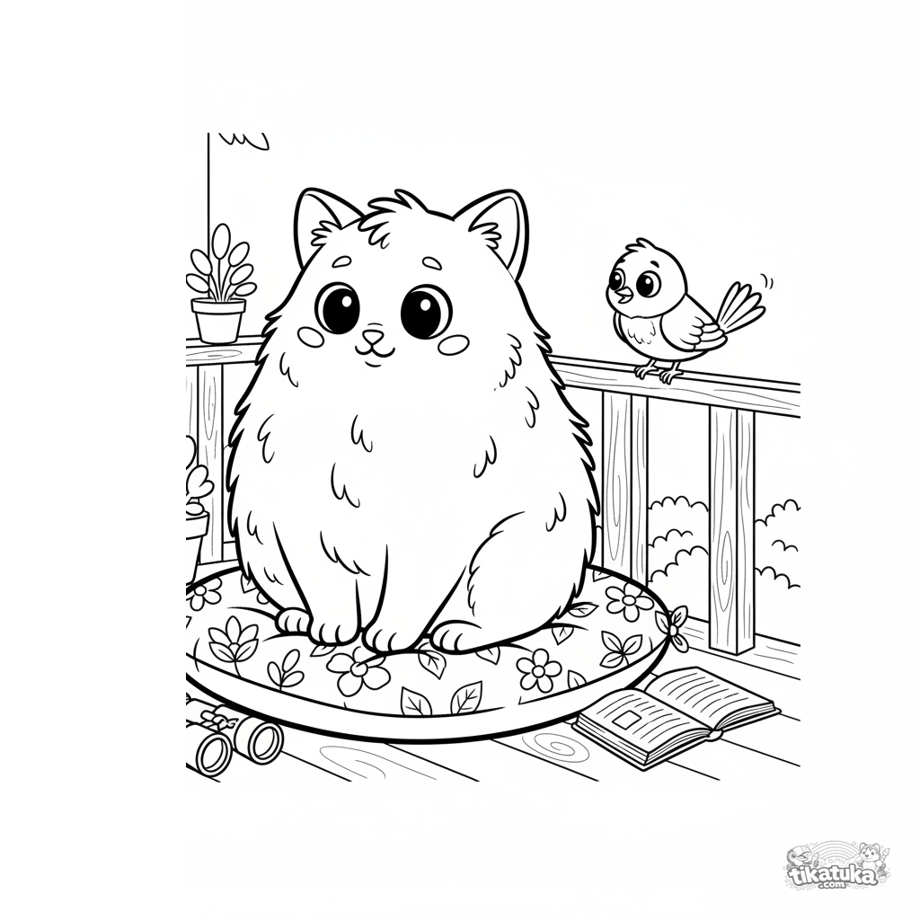 Página para colorear para niños 4-6: un gato esponjoso en un cojín del porche observa con curiosidad a un pajarito en la barandilla. Escena dulce y divertida con prismáticos.