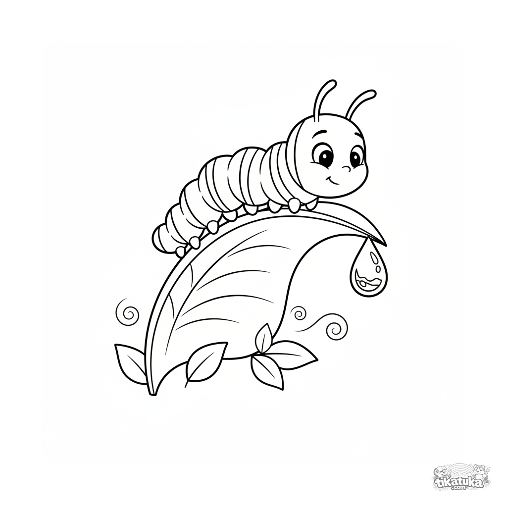 Página para colorear para niños de 4-6 años: una oruga rayada viaja por el borde de una hoja grande con una gota de rocío. Contornos suaves de libro de cuentos, detalle equilibrado.