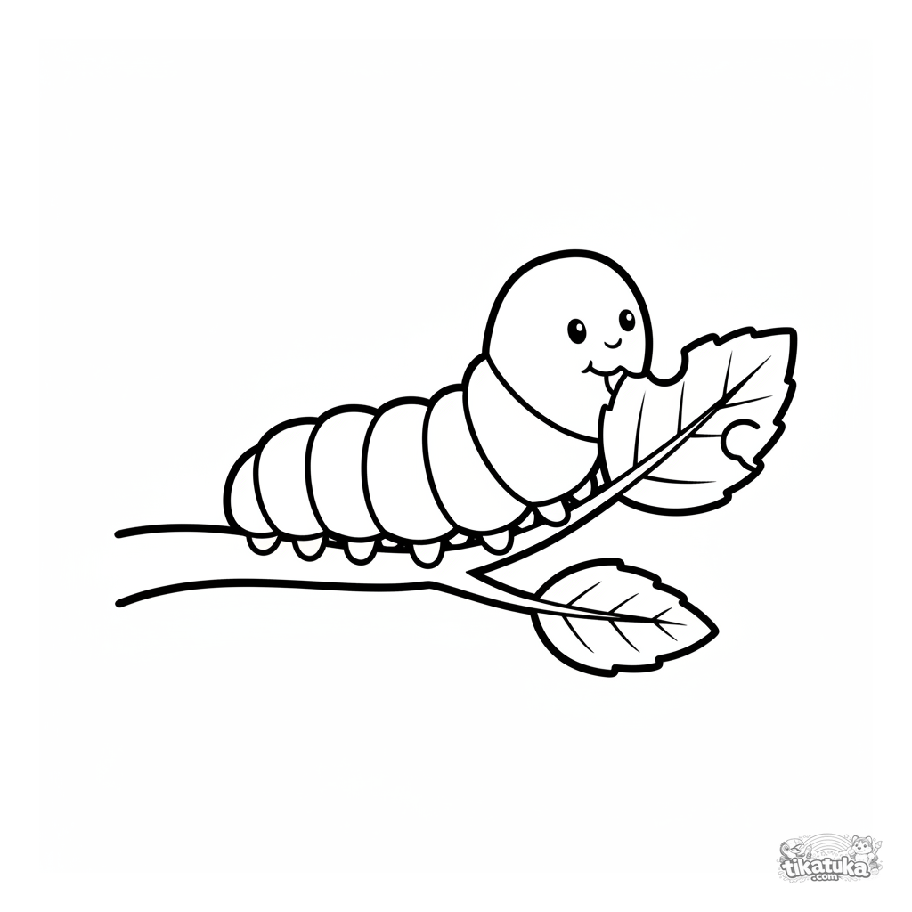 Página para colorear simple para niños pequeños de 2-3 años, con una oruga regordeta a rayas en una rama. Formas grandes y claras, mínimo detalle, ideal para primeras experiencias.