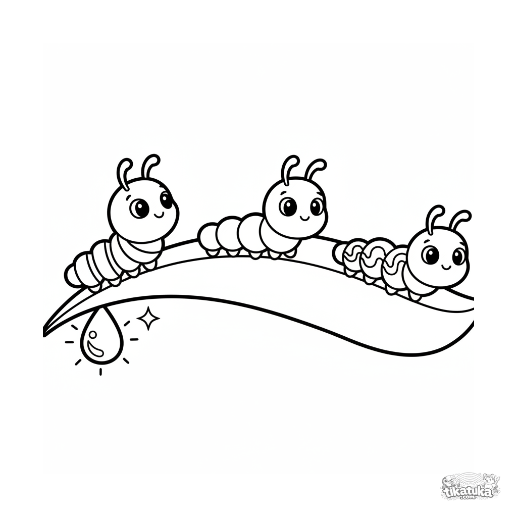 Página para colorear para niños pequeños 2-3: tres orugas alegres desfilando por un puente de hoja sobre una gota de rocío. Formas simples.