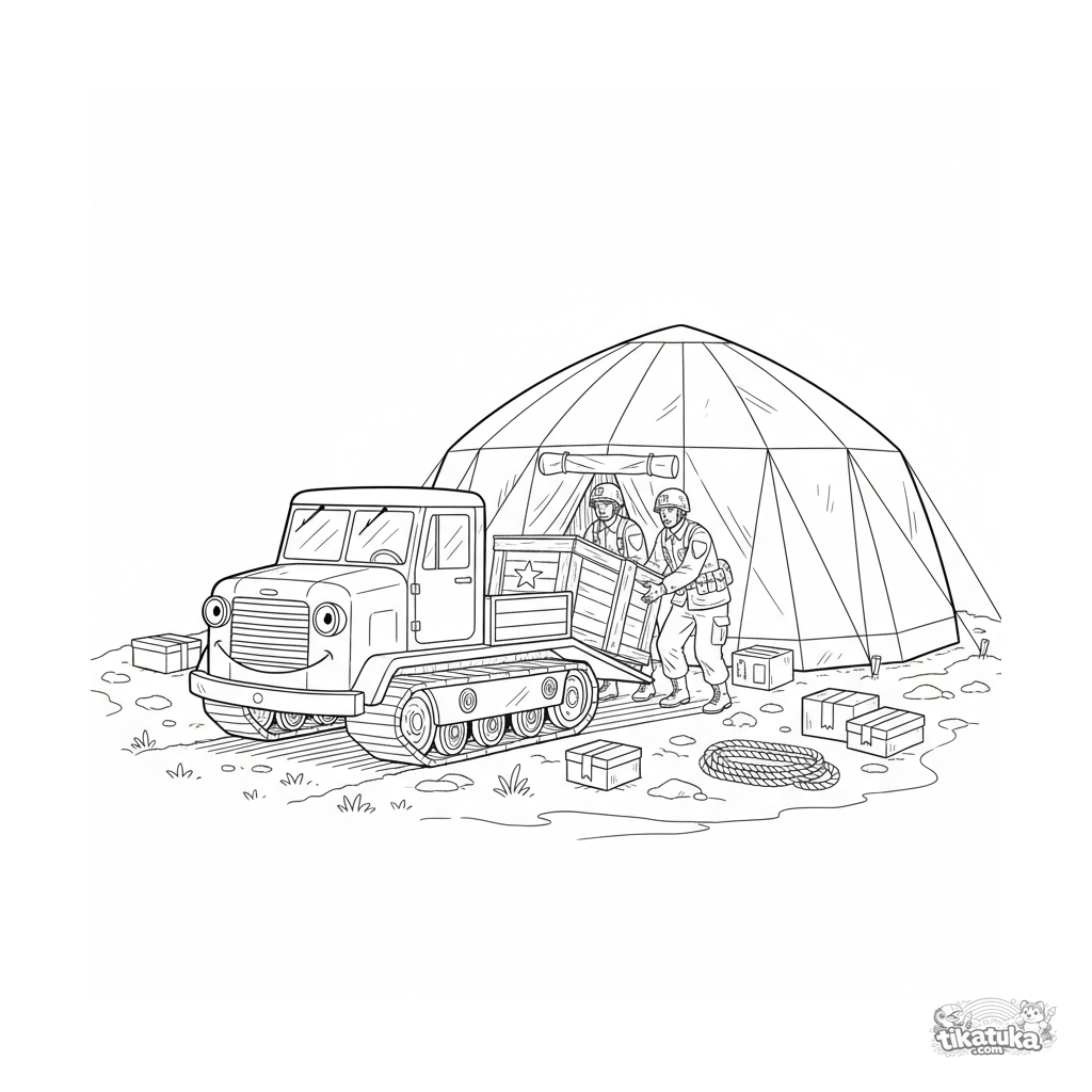Página para colorear para mayores 10-12: un detallado transporte de suministros oruga descargando cajas junto a una carpa de almacén en el cuartel general de campo. Los soldados ayudan en el trabajo.