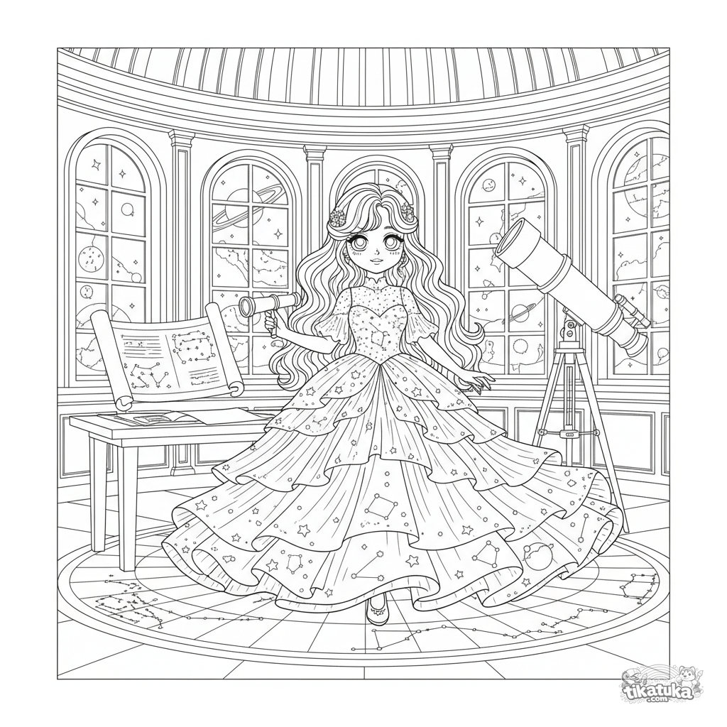 Página para colorear mágica para niñas 10-12: vestido de gala con constelaciones bordadas en un observatorio. Estilo anime detallado, cartas astronómicas e instrumentos.