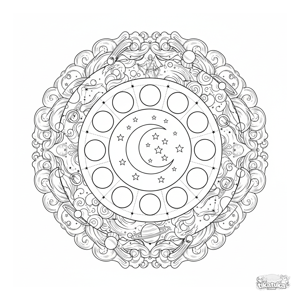 Página para colorear de mandala celestial detallada para 10-12 años. Representa la luna, estrellas, fases lunares, constelaciones y planetas en un patrón circular simétrico.