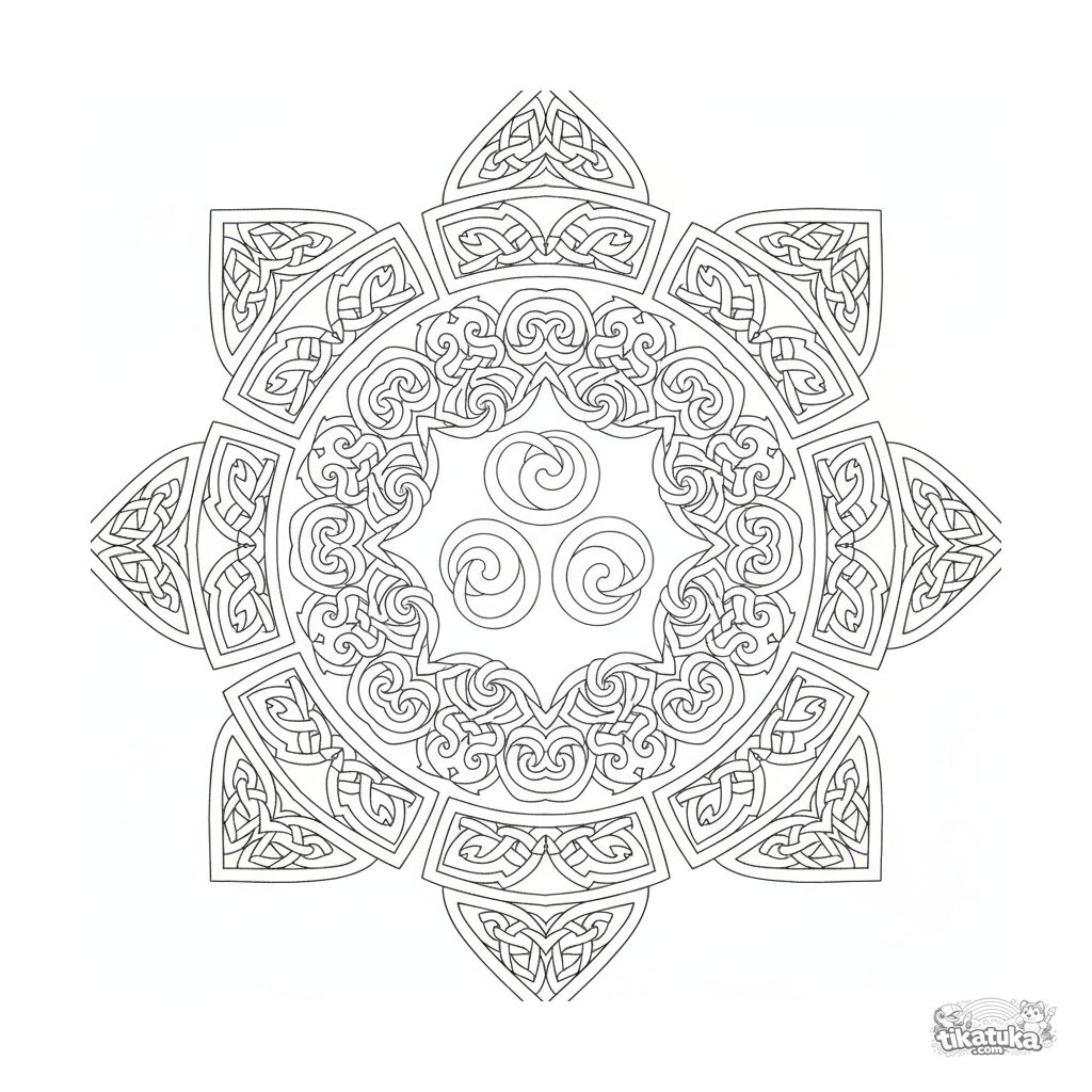 Detallada página para colorear de mandala de nudo celta para 10-12 años. Símbolo trinitario central, anillo de espirales entrelazadas, nudos exteriores, complejo entrelazado simétrico de cuatro partes.