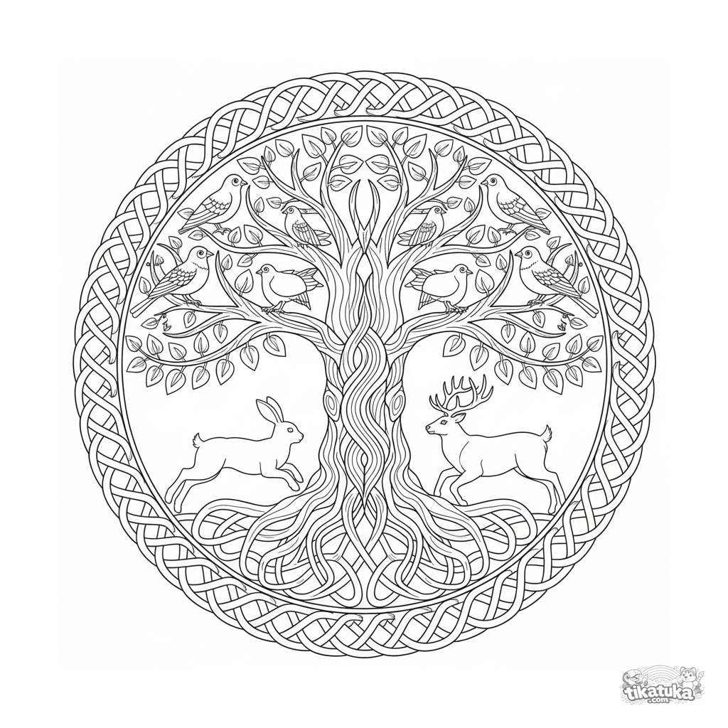 Página para colorear de mandala celta del Árbol de la Vida intrincada para 10-12 años. Árbol hecho de nudos trenzados, siluetas de animales escondidas en ramas, borde de nudo continuo exterior.