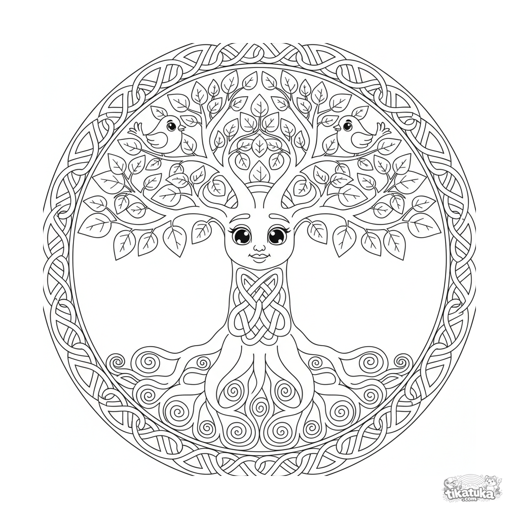 Página para colorear de mandala celta del Árbol de la Vida intrincada para 10-12 años. Tronco y ramas de nudos tejidos, raíces, hojas y pájaros. Patrón de nudos simétrico.