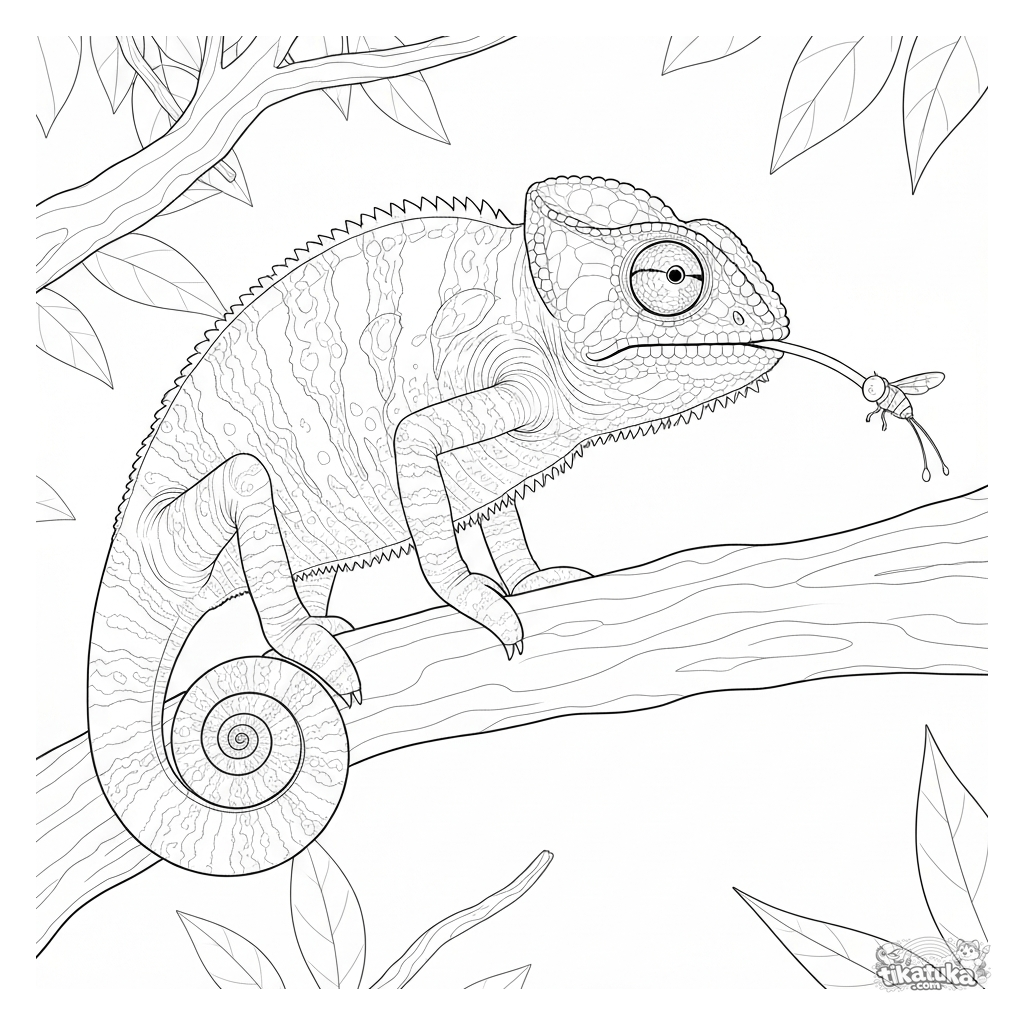 Página para colorear detallada de un camaleón para niños de 8 a 12 años. El camaleón se camufla en una rama de la jungla, ojos giratorios, lengua extendida.