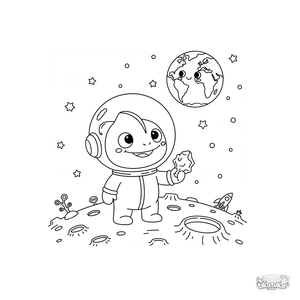 Página para colorear del espacio para niños de 4-6 años: el camaleón de peluche Radik en traje espacial explora la superficie lunar. Estilo de mascota escandinava.