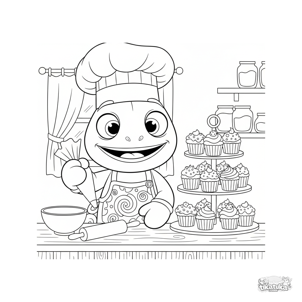 Página para colorear para niños: el camaleón Radik con gorro de chef decora una torre de cupcakes. Personaje lindo, formas simples, para 4-7 años.