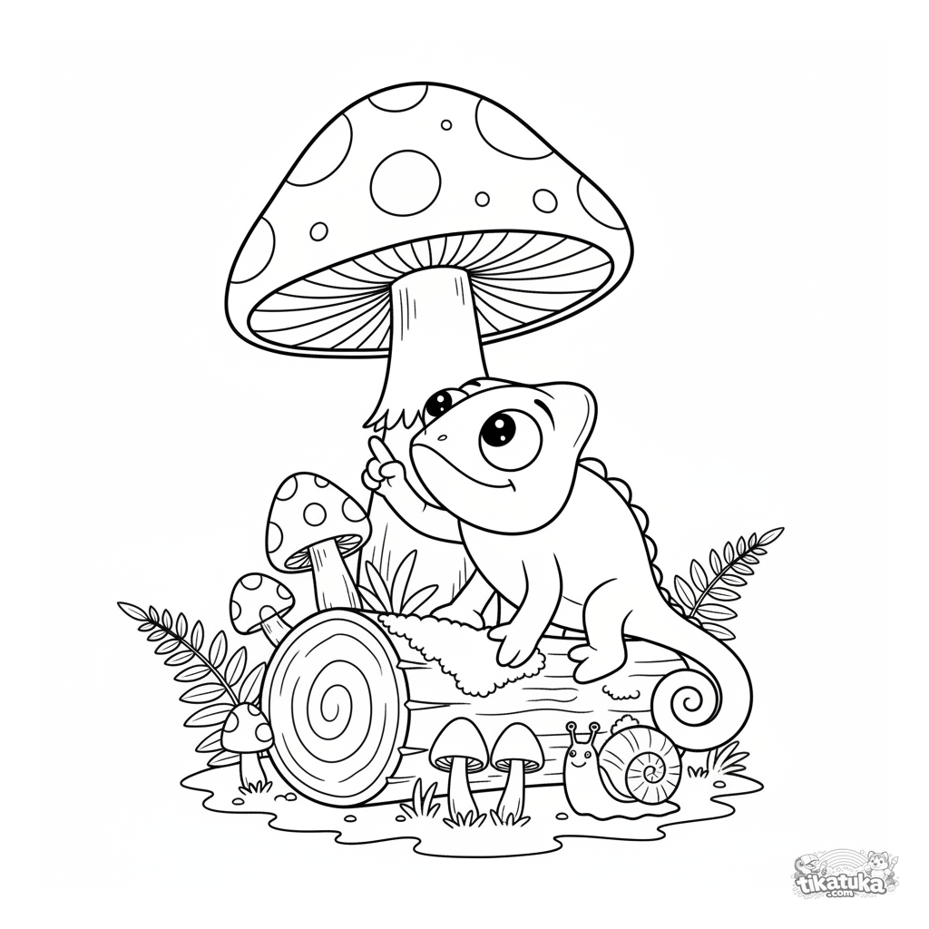 Página para colorear para niños: el camaleón Radik en un bosque mágico entre hongos gigantes. Líneas simples y claras, escena linda, para 4-8 años.