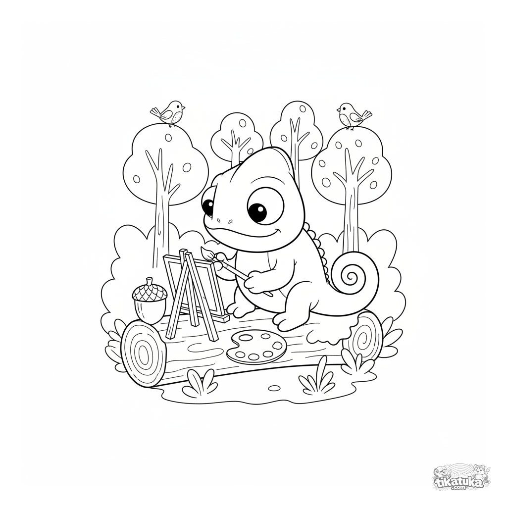 Página para colorear para niños 4-6: lindo camaleón Radik pintando en el bosque en un pequeño caballete. Estilo peluche escandinavo, líneas simples, márgenes amplios.