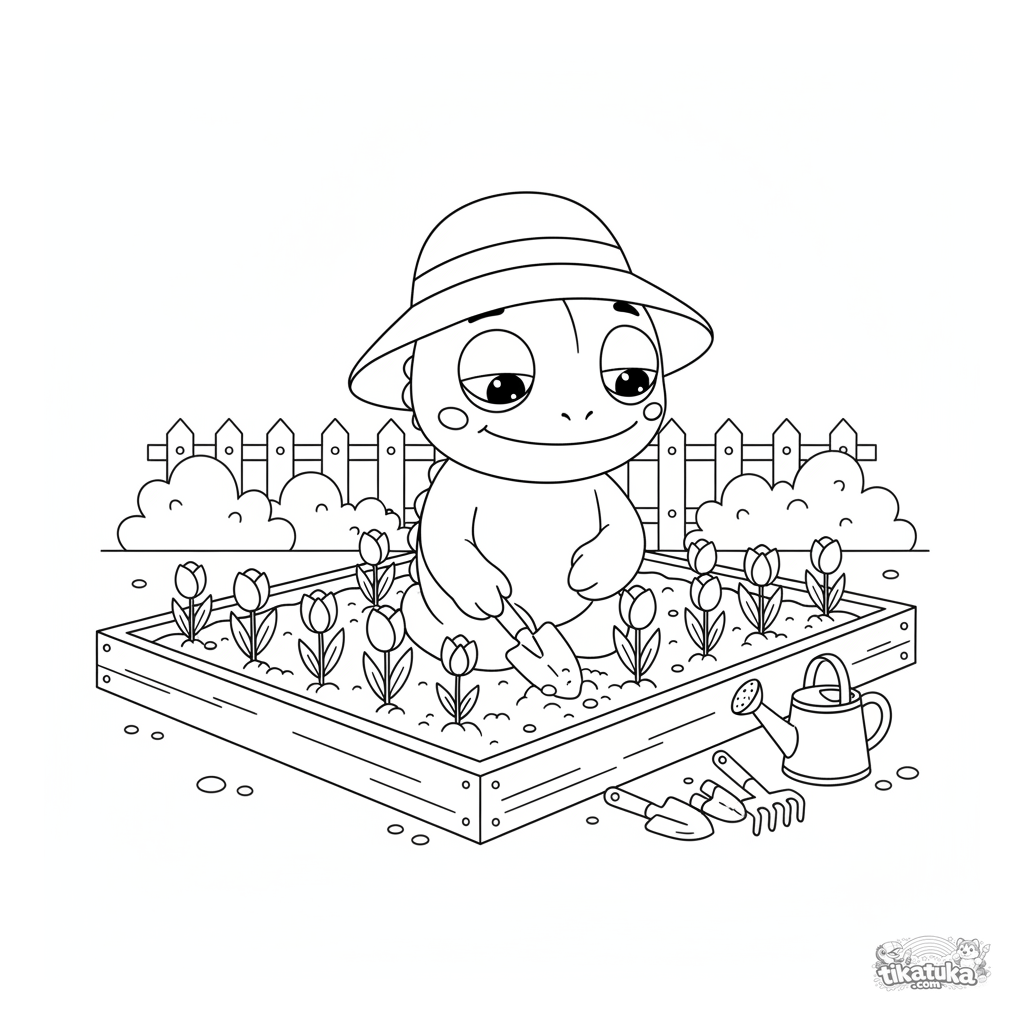 Página para colorear para niños: camaleón Radik plantando tulipanes en un jardín primaveral. Escena tranquila y linda sobre la naturaleza.