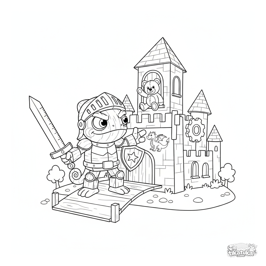 Página para colorear para niños de 4-6 años. Camaleón Radik como caballero rescata un osito de peluche de un castillo de cartón. Estilo de juguete de madera, formas simples, márgenes amplios.