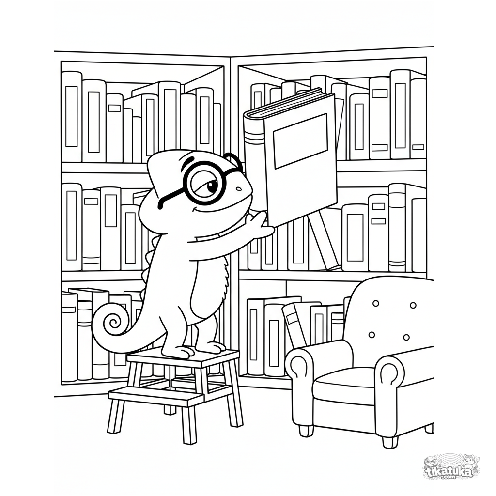 Página para colorear para niños: camaleón Radik trabaja como bibliotecario en un rincón de libros acogedor. Escena linda sobre la lectura.