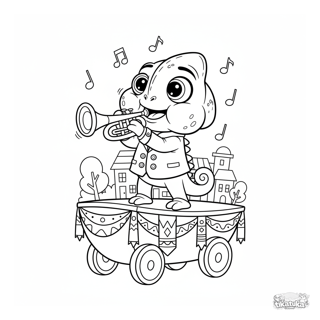 Página para colorear para niños: camaleón Radik toca la trompeta en una banda de desfile. Escena divertida y dinámica sobre música.