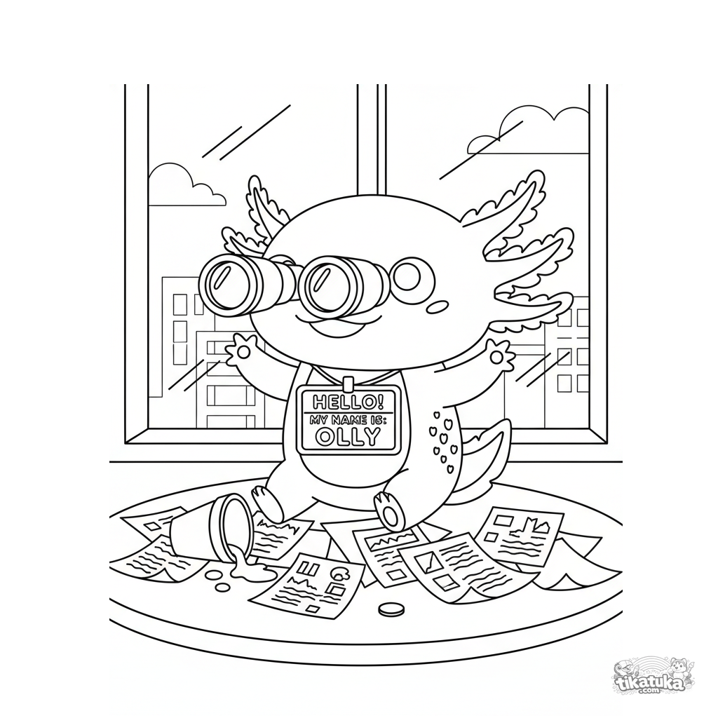 Página para colorear para niños 10-12: un ajolote caótico en una oficina se aprieta contra la ventana, mirando con binoculares su pago. Meme divertido detallado.